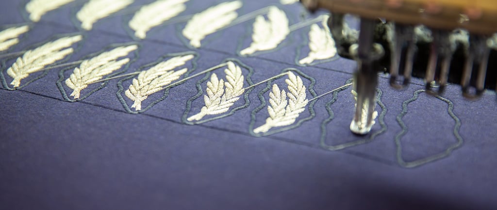 Broderie d'un blason familial sur une serviette de table